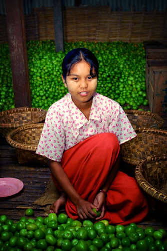 Young woman sorts tomatoes. Lake Inle is the first producer of tomatoes in Myanmar. In fact, the culture is hydroponic, the tomatoes are grown on floating gardens, with their roots directly in water. NASA did not invent the technique! What struck me is the contrast between the piles of green tomatoes and this beautiful woman's red pants. |