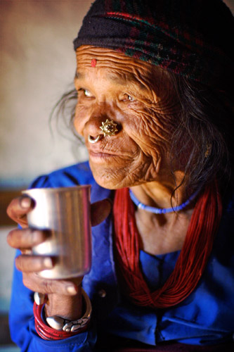 Old Tamang woman. She was drinking her morning tea, in the Lapsiphedi district, north of Kathmandu. She found it extremely amusing I wanted to take her picture. This image is in a rare moment of calm, as she looked outside. Young Tamang girls, because of their beauty, are often kidnapped from Nepal and sold to Indian brothels, 8000 of them yearly. I was helping a non-govenmental organization develop photo ID cards to help track little girls at border posts, as a way to curb this unfortunate traffic. |