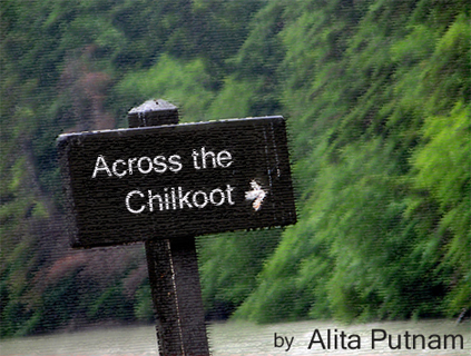 This, then, is where it begins, with a simple trailhead at the curve before the Dyea bridge. A fan of powdered root-dirt spills over rocks and dribbles into the grass and gravel. A gust of wind and the trees exhale pollen and dust. Angular bootprints overlap each other in a jostle for permanence. A camera whirs, preserving the broad clean grins of hikers as they pose next to the Chilkoot Trail sign. One more, someone says, I had my eyes closed! and there are groans and shifts of weight as people flex their shoulders under their packs. Then another contrived grin and the camera is tucked away and there are claps on shoulders as hikers turn to the trail, stepping up into the trees. Bright packs span the length of their backs to rest on half-hidden buttocks, colored rings of heavy socks decorate their ankles; bare knees crease with each step until they are swallowed up by the trail.